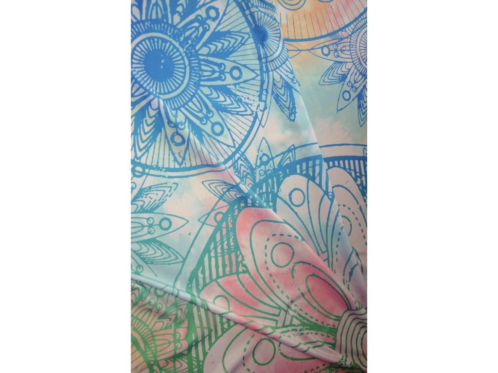 Do všech stran velmi dobře pružící úplet, přitom však drží tvar, potištěný, neprůhledný. Na omak působí jako "saténový", na první omak chladí a šaty z něj ušité "netíží". Skvěle se hodí na šití šatů, sukní, tunik, triček, legín, ve kterých se potkat se ženou oblečenou do stejného vzoru je opravdu malá pravděpodobnost
